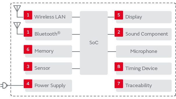 Growth is anticipated in the market for AI speakers. Inheriting technology developed for mobile phones and smartphones, Murata products such as wireless communication modules, sensors, and capacitors contribute to the realization of more compact, thinner, and more power-efficient AI speakers.