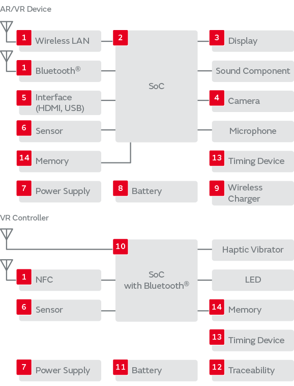 Growth is anticipated in the market for AR and VR devices. Inheriting technology developed for mobile phones and smartphones, Murata products such as wireless communication modules, sensors, and capacitors contribute to the realization of more compact, thinner, and more power-efficient AR and VR devices.