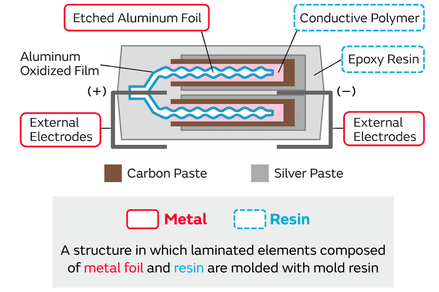 By contrast, the main constituent components of our ECAS series of polymer aluminum electrolytic capacitors are composed of metal (aluminum) foil and resin. Accordingly, the ECAS series has extremely high mechanical strength compared to MLCCs.