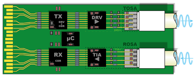 • High frequency noise rejection performance for DC-Decoupling capacitor on bias lines, enabling modules standardization with high RX sensitivity and high TX swing