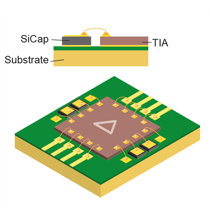 The use of Murata's silicon integrated passive device (IPD) technology enables both miniaturization and performance improvements for optical communication devices. For example, silicon interposers for TOSA enable the integration of all capacitors and resistors, which are conventionally mounted separately. This further improves stability in response to changes in temperature and voltage. As a result, it is possible to reduce the amount of mounting work, achieve miniaturization, and improve performance.