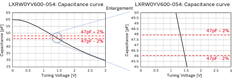 The capacitance value of a variable capacitor is altered by applying a voltage. By making use of this property, optimum characteristics can be obtained in circuits with tight tolerance requirements by adjusting the applied voltage.