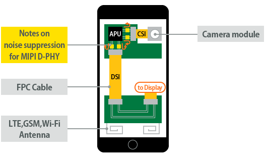Noise is emitted from the FPC cable by digital signals that pass through MIPI D-PHY lines between the main board and module, and this noise can enter the antenna in the wireless circuit, which can result in reduced reception sensitivity of the antenna. For this reason, noise passing through MIPI D-PHY lines must be removed.