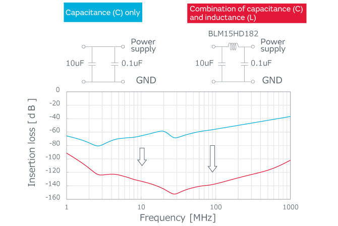 Countermeasures that use only capacitors will require a capacitor with a large capacitance value that covers the low frequency side, and a low ESL capacitor for obtaining a high frequency insertion loss.