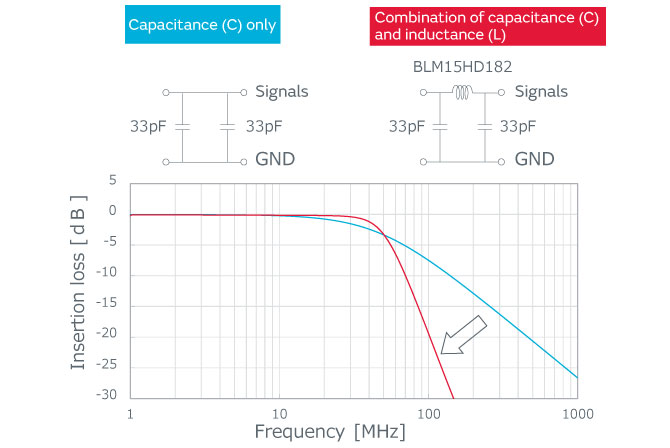 Countermeasures that only use capacitors are possible when noise levels are small or when the frequencies of the signal and the noise are separated; however, especially when the signal frequency and the noise frequency are close, it becomes necessary to configure filters having sharp insertion loss characteristics by combining inductors and capacitors.