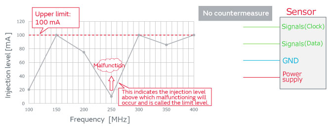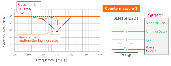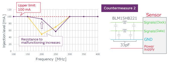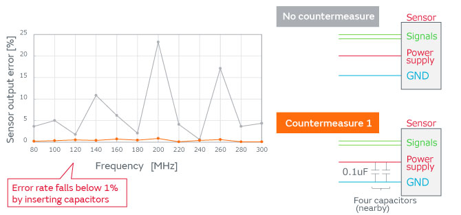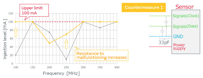 By putting countermeasure 3 (recommended circuit) into practice, it was confirmed that noise resistance became favorable across the entire frequency bandwidth.