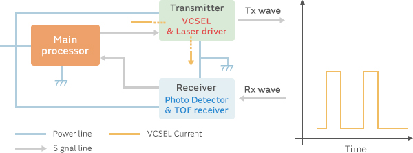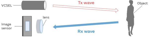 ToF stands for “time of flight,” a measurement method in which the time differential between the radiated wave and the reflected wave is used to determine the distance to an object.