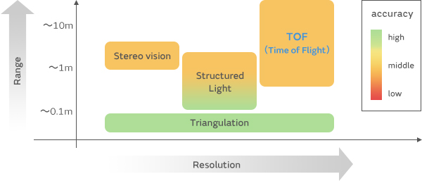 Aside from ToF, there are other types of distance measurement such as methods that use stereo cameras or structured light methods that emit patterns of infrared radiation and then measure distortion in the patterns. However, ToF has the advantages of structural simplicity, support for a broad range of distances, and high resolution, and is therefore considered well suited to smartphones.