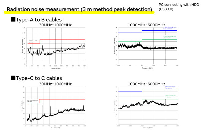 USB cables perform differential transmission of signals using a twisted pair structure that does not easily radiate noise.