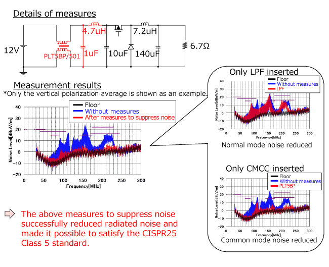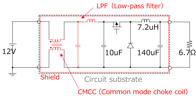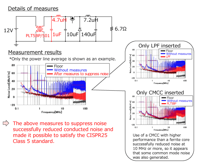 → Insert an LPF near the power connector. (Measure to suppress normal mode noise at 20 MHz or more)