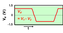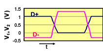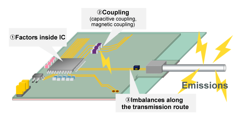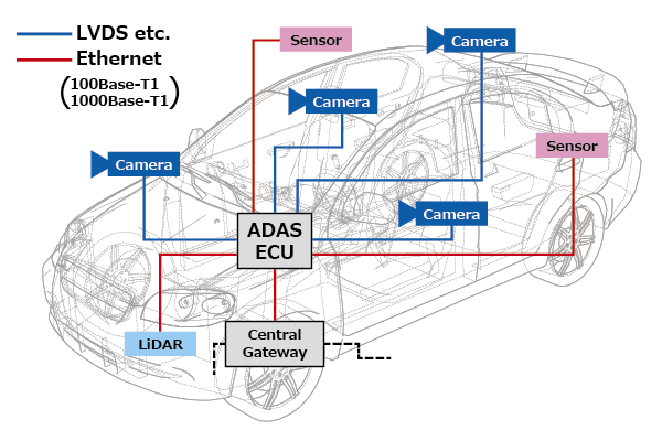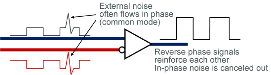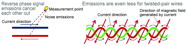 Ethernet and other automotive interfaces use differential transmission signals that have minimal emissions and are resistant to the effects of external noise. Because external noise often enters both differential transmission signal lines in the same way, this does not affect their difference, and these lines feature strong resistance to external noise. Another advantage is that, because the signal lines in the pair are adjacent to each other, any magnetic field generated by signal currents are canceled out, and so it is difficult for noise to be emitted externally.