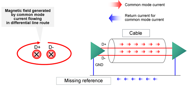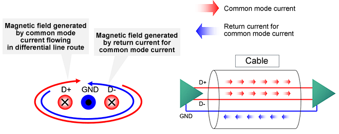 There are differences between the cables used in Ethernet and the cables for HDMI, USB, and other standards. HDMI, USB, and similar cables consist of a pair made up of a signal line and a separate ground line. As a result, even if a common mode current flows, that current passes through the ground line and returns, and so the magnetic field generated by the common mode current is canceled out, and noise emissions do not tend to occur. Ethernet cables, on the other hand, do not have a ground line, and so the route where the common mode current returns is a ground that passes through stray capacitance, and noise emissions tend to be generated more easily.