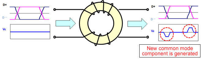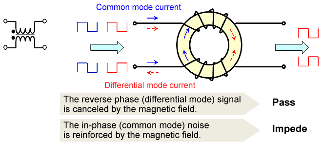 A common mode choke coil (CMCC) is effective in noise suppression measures for automotive Ethernet and other differential transmissions. A common mode choke coil is formed by winding two lines in opposite directions around a common core. The magnetic fluxes generated by both lines for the differential mode current cancel each other out, and so there is no effect on the differential current. The magnetic fluxes generated by both lines for the common mode current reinforce each other, and so it acts as an inductor. Due to this action, common mode noise can be effectively attenuated without affecting the differential signals.