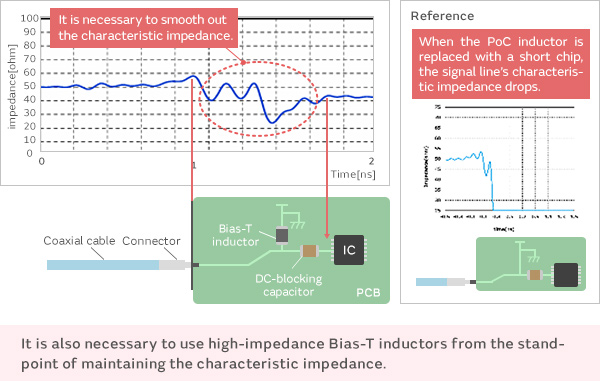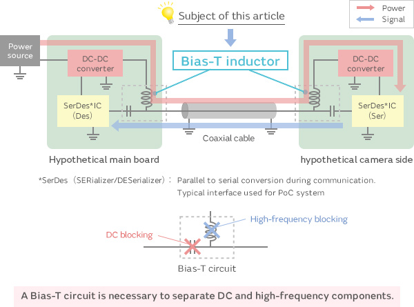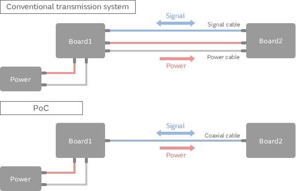 Power over coax, or PoC, is a power transmission method that sends power over signal cables, thereby eliminating the need for separate power cables. PoC is used in automobiles and industrial equipment. Automotive applications for PoC include cameras for ADAS or surround view, where it helps simplify wiring designs and allows for lighter wiring harnesses. In industrial equipment, PoC applications include cameras for visual inspections and the like. Large manufacturing lines can require very long cables, and PoC makes it possible to reduce the number of cables and simplify cable routing.