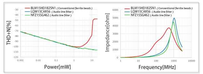 Figure 1 compares the audio characteristics (THD+N) of conventional ferrite beads with an audio line filter.