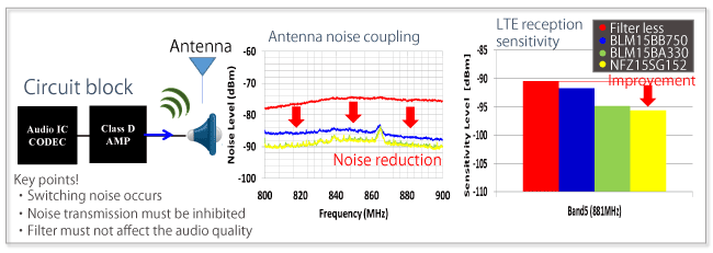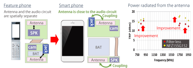 Using a high impedance audio line noise filter (NFZ Series, LQW Series) in the cellular band ensures isolation and improves the efficiency of radio wave emission compared to the antenna without the countermeasures.