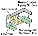The wire wound structure is formed by winding copper wire in a spiral shape around an alumina core. The coil can be formed using thicker wire than the multilayer and film structures, which provides the following features:
