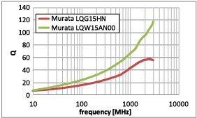 The frequency characteristics of the Q are shown in the graph by structure (wire wound, multilayer) of Murata's high frequency coil 1005 size. As shown in Figure 1, the feature of the wire wound type is the very high Q factor compared with the multilayer type.