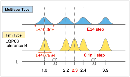 The tolerance between Murata's multilayer structure and film structure products of high frequency coils and L value lineup are shown in the following table. Compared with the multilayer type, the position accuracy of the film type is more accurate when forming the coil. Therefore, there is less variation in the L value, which allows for less tolerance and tighter steps.