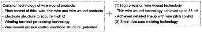 Miniaturization was realized by integrating the high precision wire wound technology, and the small size core molding technology with the common technologies of high frequency wire wound products.