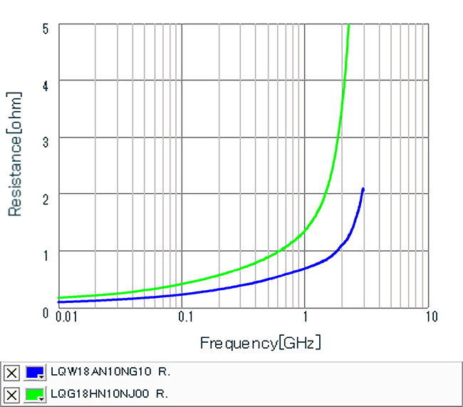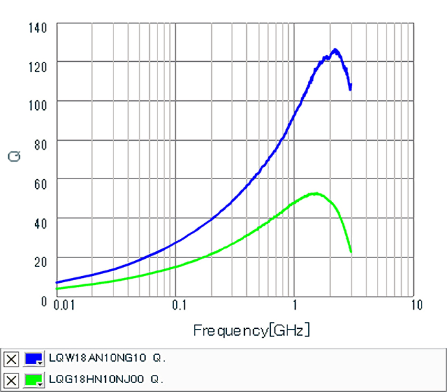 Figures 3 and 4 show the frequency characteristics of Q and R by the types of inductors indicated in SimSurfing Open in New Window . As an example, Figures 3 and 4 show the results of a 10nH inductor. Compared with the LQG series, it is clear that the inductors of the LQW series have high Q characteristics and low insertion loss.