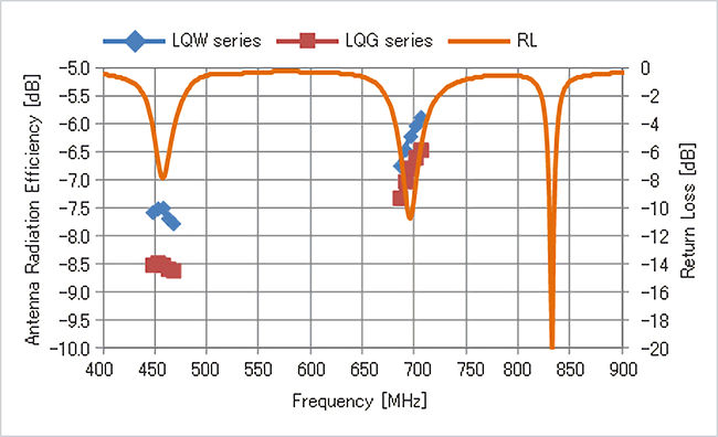 Figure 5 shows the radiation efficiency of the antenna when the type of inductor of the variable frequency chip dielectric antenna is changed. Since multiple inductors are used for the variable frequency chip dielectric antenna, an efficiency difference of about 1 dB occurs. Applying the LQW series will suppress the deterioration of the radiation efficiency to the minimum. As the inductance value to be used becomes larger, the ESR (Equivalent Series Resistance) of the inductor increases therefore, it is necessary to carefully select the type of inductor.