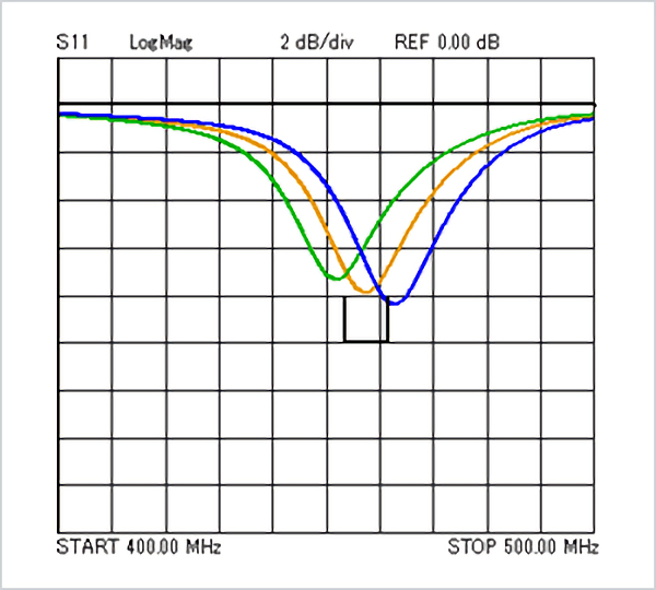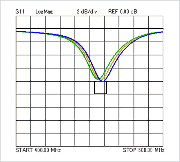 Figures 6 and 7 show the return loss waveform of the variable frequency chip dielectric antenna when the tolerance of the inductor is ±2% and ±5%. When an inductor with a ±2% tolerance is used, the necessary band can be covered even though the resonance frequency varies; however, when an inductor with a ±5% tolerance is used, the resonance frequency will shift out of the necessary band, which becomes a concern regarding the deterioration of the radiation characteristics.