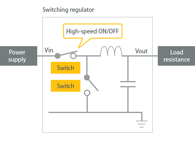 The switching regulator consists of a circuit combining switching elements, inductors, capacitors, and other functional parts. The switch is turned ON or OFF at high speed to enable adjustment of the output voltage, and ideally, the voltage is converted without any power loss.