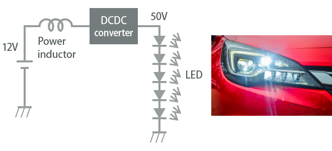 In head lamps, step-up DC-DC converters are primarily used for LED lighting. The output voltage is adjusted based on the number of lights. The DC-DC converters for head lamps are characterized by the use of power inductors with large inductance values similar to those in LED backlights for smartphones.