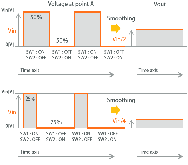 Figure 2-5-3 shows the relationship between the point A voltage and Vout during the switching operation. The upper figure shows the case when the SW1 ON time is 50% overall, that is, the duty ratio is 50%. The voltage in this stage is smoothed so that the 50% of Vin (Vin/2) is output as the output voltage Vout. The lower figure shows the case when the duty ratio is 25%. The 25% of Vin (Vin/4) is output as the output voltage Vout.In other words, when the output voltage is high, the duty ratio becomes higher, and when the output voltage is low, the duty ratio becomes lower. In this way, in the switching regulator, the switching duty ratio can be changed to control and output various voltage values.
