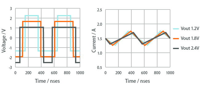 Vin and Vout are parameters that determine the size of the voltage applied to the inductor and the duty ratio. This shows that, when Vout fluctuates, the voltage waveform changes in multiple ways (Figure 2-5-6). This also shows that the frequency changes due to fluctuations in other parameters, but the voltage size and duty ratio do not change. The current waveform also changes due to this voltage fluctuation.