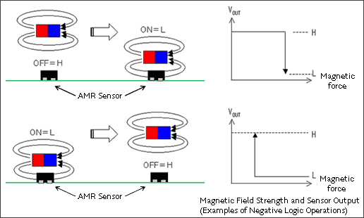 Because the positive and negative sides have symmetric characteristics, the same operation is performed even if the north and south poles of the magnet are reversed. This characteristic is used to enable the gathering of high-accuracy, high-reliability data without making contact. Also, the capability of detecting without contact can be used in a wide range of applications such as open/close detection, rotation detection, and position detection.