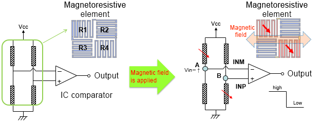 In a magnetoresistive element, the resistance changes when a magnetic field is applied perpendicular to the electrical current direction. AMR sensors have a wide range of placement patterns as shown in the figure, and they consist of a combination of elements that change the resistance (R1, R4) and elements that do not change the resistance (R2, R3).