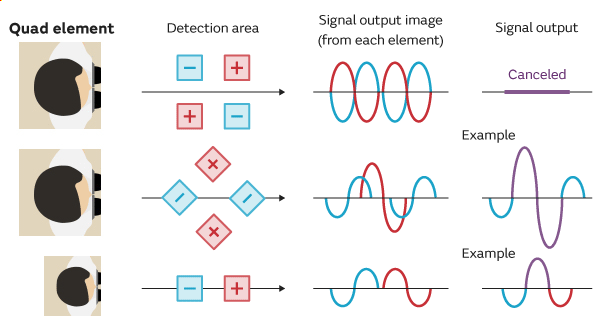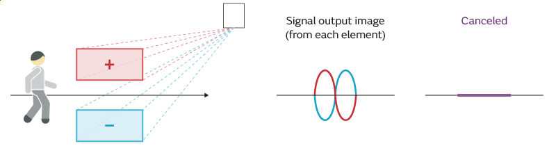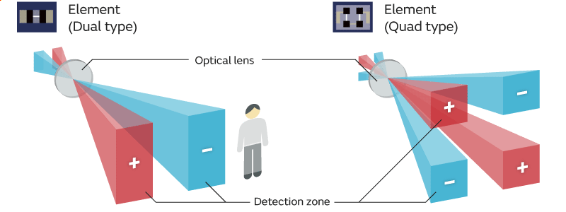 Because the polarities are configured in a crisscross form, the quad type sensors are also sensitive in the vertical direction in contrast to the dual type sensors. Therefore, they are suitable for use in ceiling-mounted sets that place the detection area below the sensor.
