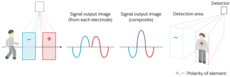 Because it is sensitive to input which sequentially crosses (horizontal) the two electrodes, this type is suited to use in wall-mounted sets (human body detection from movement in the horizontal direction).