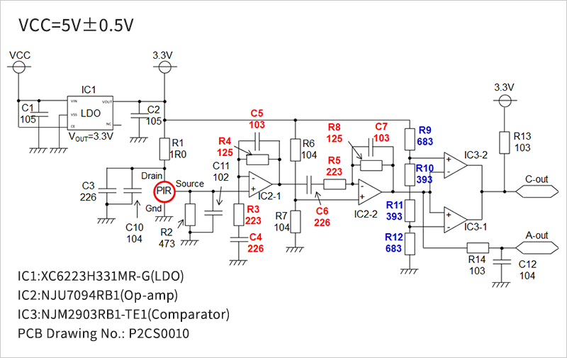 *To adjust the threshold value level, change the value of the components displayed in blue characters in the circuit diagram (R9, R10, R11, R12).