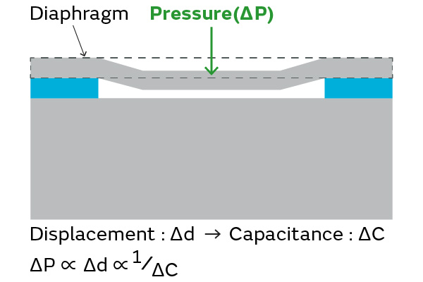 Murata barometric pressure sensors use a capacitive type, converting the capacitance value between the diaphragm and electrodes to an atmospheric pressure value.