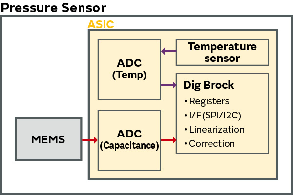 The ASIC interior contains a temperature sensor which outputs a temperature compensated atmospheric pressure value. They are also compatible with I2C/SPI digital interface by using built-in ADC and filter.