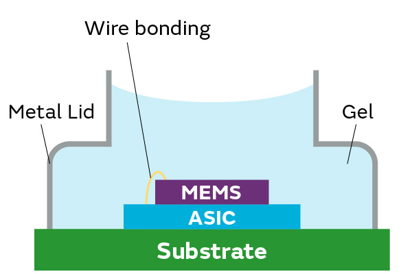MEMS, ASIC, metal lid, gel, board, wire bonding