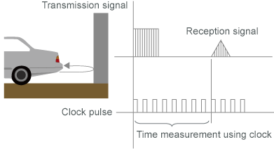 Pulse signals are transmitted, the ultrasonic waves reflect off of obstacles, and the distance to the obstacles is measured based on the time until the reflected waves are received.