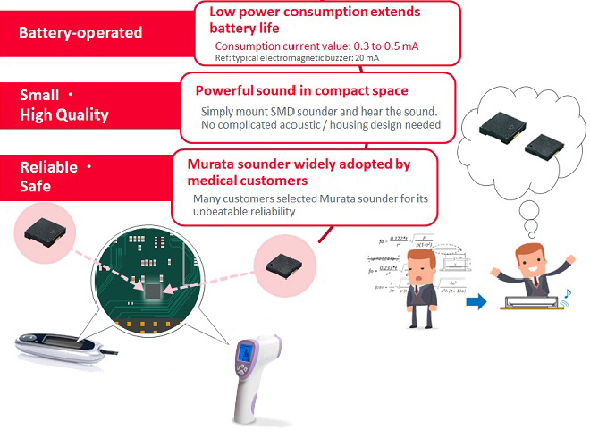 Crystal units is used in the microcomputers and wireless communication ICs in various COVID-19 countermeasure products such as non-contact thermometers, pulse oximeters, trackers, test kits and analyzers, ventilators, and dispenser for alcohol and hand soap, in healthcare products such as insulin pens, inhalers, blood glucose meters, blood pressure monitors, bathroom scales, and activity meters. Piezoelectric sounders are used for confirmation sounds in these products.