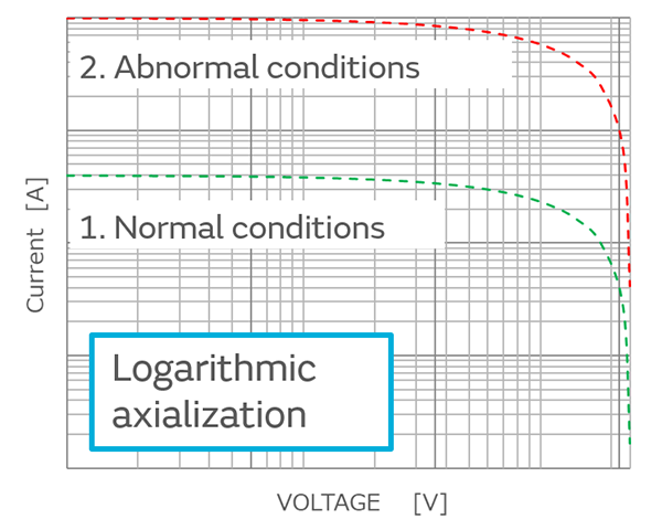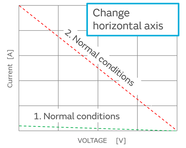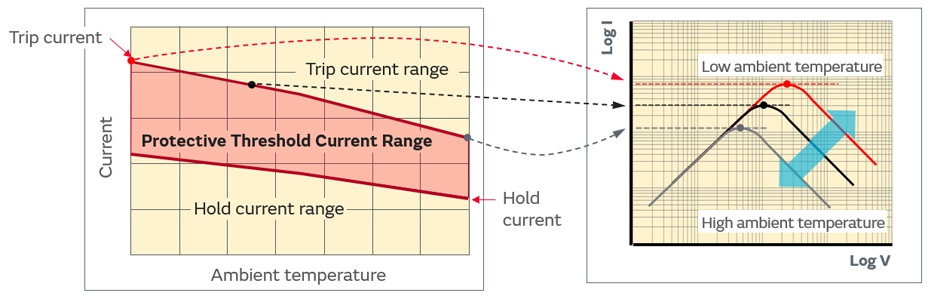 As definition, the horizontal axis is defined as “voltage drop at PTC =Power supply voltage - voltage drop at circuit resistance”, As the definition, if the horizontal axis is changed to “voltage drop at PTC = power supply voltage - voltage drop at circuit resistance” and both vertical and horizontal axes are displayed logarithmically, the characteristics will be as shown in Fig. 5.