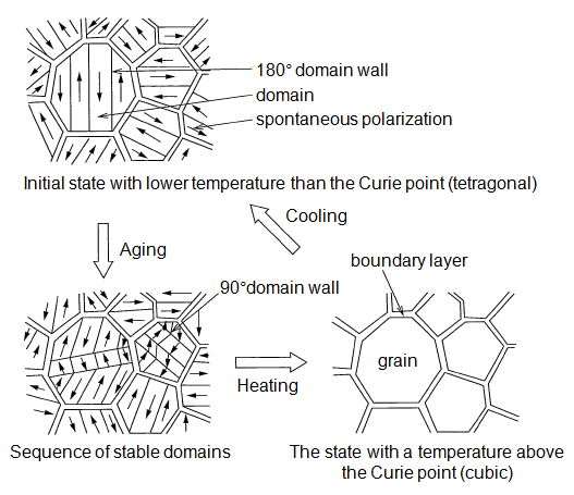When the structure is left without load with a temperature below the Curie point, over time, domains that were randomly oriented become larger in size, and the sequence is gradually rearranged to the energetically stable form (as shown in the figure, 90° domain) and the stress caused by distortion of the crystal gets released.