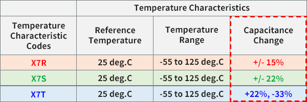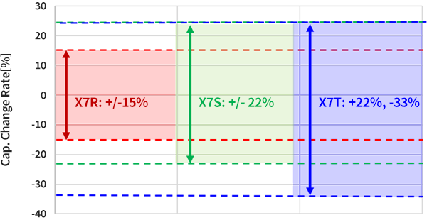 Considering the capacitance change ratio as stipulated in the EIA standard, we can say that the capacitance change ratio within the operating temperature range becomes larger in the following order: X7R < X7S < X7T.