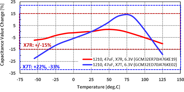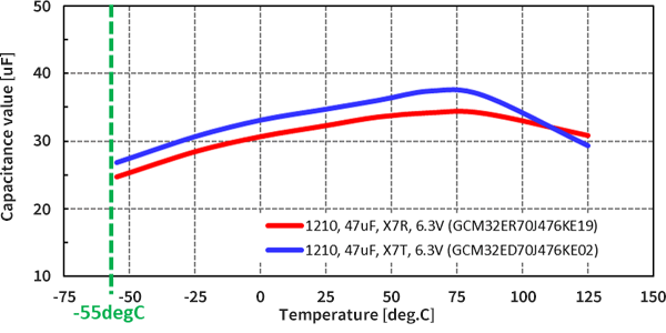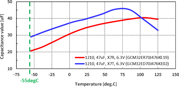 In addition, a comparison at -55°C when the capacitance change ratio of both the X7R and the X7T is at its largest shows that the effective capacitance of the X7T is greater than that of the X7R.