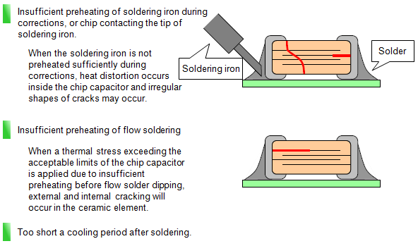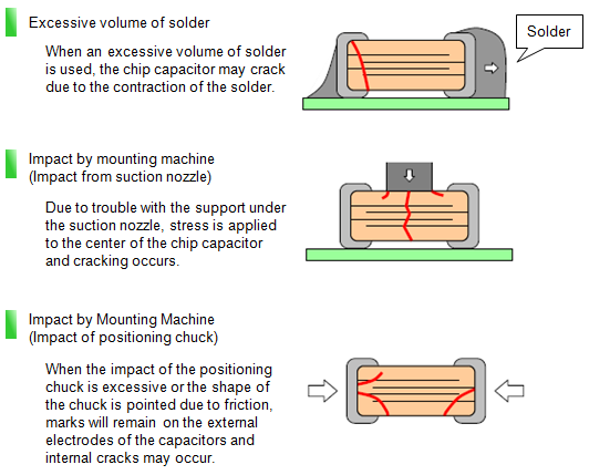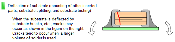The main cause of cracking is mechanical stress, such as the mechanical/thermal stress when mounting on a substrate and deflection of the substrate after mounting.