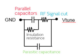 The capacitance between VTune and GND is 12.8 nf * and parasitic capacitance is about 0.5 pf.